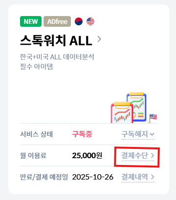 프리미엄 메뉴에서 구독 중인 서비스를 확인하시면 ‘결제수단’ 링크가 추가되어 있습니다.