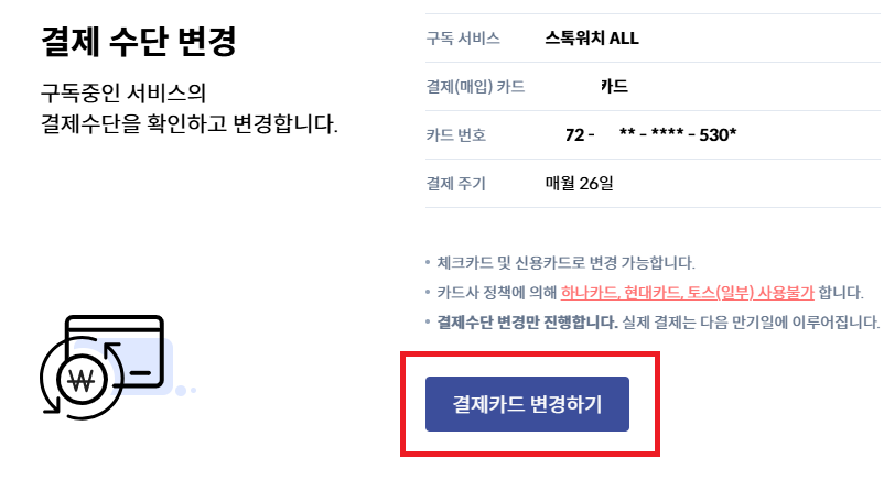 해당 링크를 클릭하면 결제수단 변경 안내 페이지가 열리며,