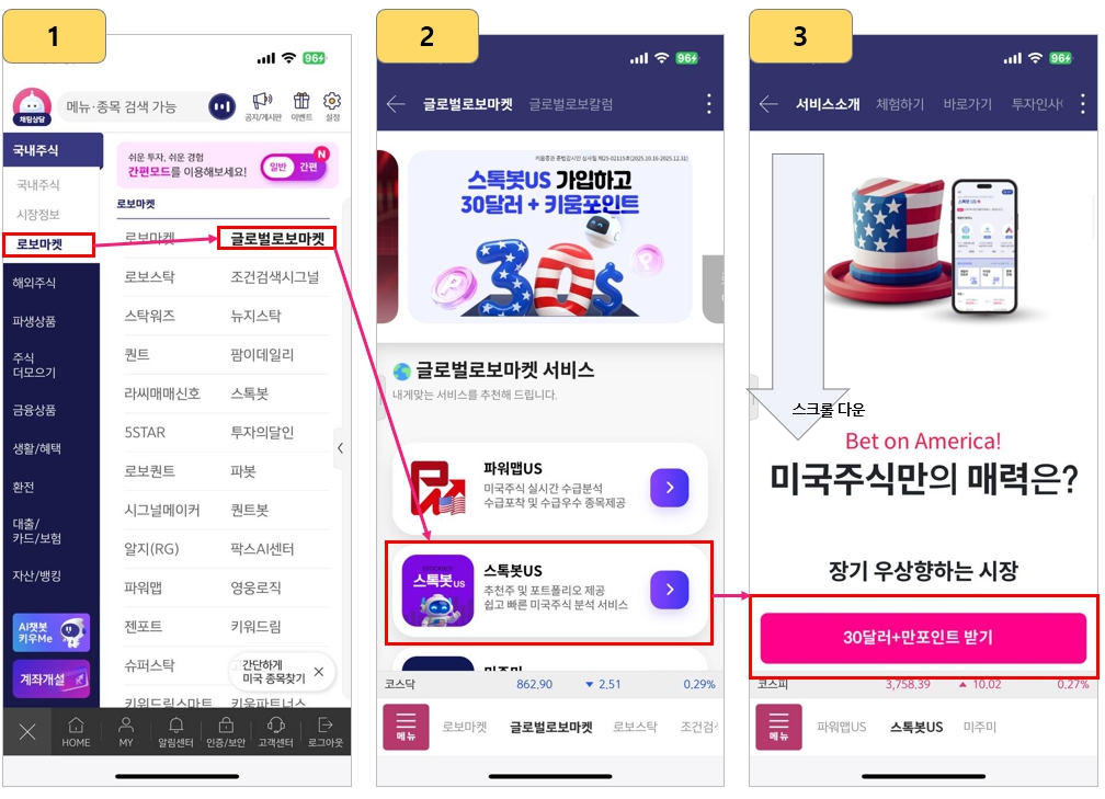 1. 키움증권 영웅문 MTS - 국내주식 - 로보마켓 - 글로벌로보마켓