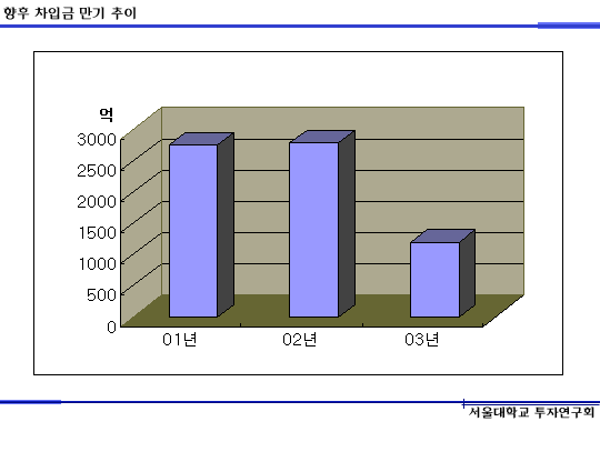 2001년 9월 기준으로 5193억의 회사채 잔액이 남아 있습니다. 금년에 2750억을 갚았으니 얼마나 많은 회사채를 발행했었나 짐작케 해줍니다. 내년에 갚아야 할 금액이 2792억인데 요게 바로 KTB의 주가의 발목을 잡는 것입니다.