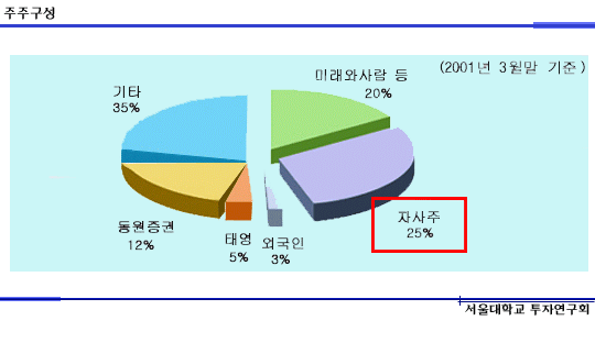 자사주는 단언하건대 확실히 KTB의 기업가치에 타격을 입힌 요소입니다. 자사주물량은 전체 지분의 25%에 육박하는데 평균매입단가가 11000원입니다. 현재 주가를 고려해본다면 KTB는 자사주 투자로 인해 50% 이상의 손실을 본 셈입니다.