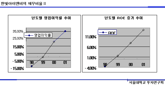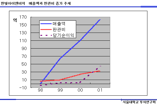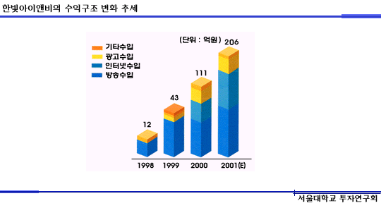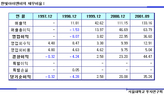 이러한 한빛아이앤비의 비즈니스적인 장점들은 기업의 성적표라 할 수 있는 재무제표에서 그대로 파악할 수 있습니다. 비록 97년에 설립되어 98년에 본격적인 서비스를 시작했기 때문에 근거 자료가 크지는 않으나, 오히려 그 짧은 기간에 이 정도의 성적표를 만들었다는 것은 높이 살만 합니다.