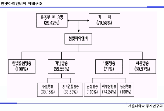 작년에 경기, 인천 지역과 부산 지역의 SO들을 집중 매수하여 계열사로 편입을 시켰으며, 인수를 통한 다른 지역으로 확장은 계속될 것으로 생각됩니다. 아래는 현재 한빛아이앤비의 지배구조입니다.