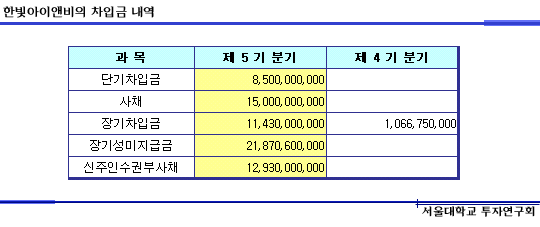 그러나 크게 걱정하지 않으셔도 좋을 듯 합니다. 왜냐하면 위에서 한빛아이앤비에 대해 분석했듯이 SO 라는 것이 일정궤도에만 올라가면 현금을 창출해내는 캐쉬프린팅머신이기 때문입니다. 또한 인터넷은 아직도 보급중인 상태에 있으며, 케이블TV도 전국적으로 보면 보급율이 높지 않아 수요가 꾸준히 있을 것으로 봅니다. 따라서 자회사 SO들에서 나오는 현금흐름으로 부채를 상환할 능력이 충분히 있다고 판단되며, 올해 부채가 다소 높은 상태에서 지분법 이익 등으로 한빛아이앤비의 수익과 ROE 등의 지표가 높게 나올 가능성도 배제할 수는 없습니다.