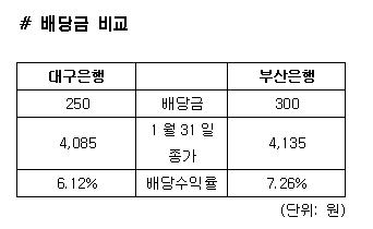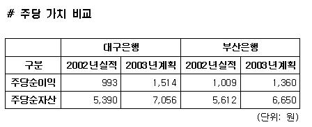 부산은행도 2001년 보다 957억원 많은 1480억원의 순이익을 내 1967년 창립 이후 최고 실적을 올렸다. 주목할 점은 높은 시가배당률이다. 부산은행 배당금은 주당 300원. 배당기준일(02. 12. 26) 기준으로 배당수익률이 5.92%, 1월31일 기준으로는 7.26%다. 지금까지 배당을 발표한 국내은행 중 최고 수준이다.