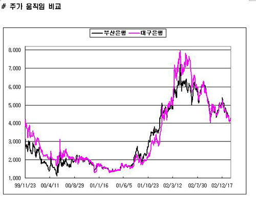 주가도 엎치락뒤치락을 반복했다. 2000년 상반기까지만해도 대구은행은 단연 지방은행의 선도주였다. 하지만 대구은행이 2001년 상반기 부실채권을 대거 정리하면서 318억원의 적자를 내자 다시 부산은행의 주가가 대구은행을 앞질렀다. 그 뒤 연말 최종 결산에서 대구은행이 307억원의 흑자를 기록하면서 또 한번 격차가 좁아지더니 2002년 2월5일 드디어 역전에 성공했다. 부산은행 주가를 눌렀던 그날 대구은행 직원들이 일손을 멈추고 박수를 치며 환호했던 사진이 신문에 등장하기도 했다.