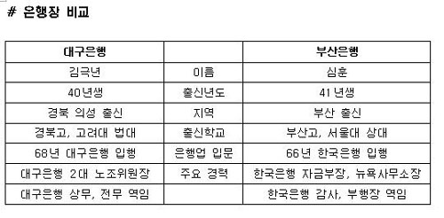 두 은행의 사령탑은 지금의 두 은행이 있도록 큰 공헌을 한 인물들이다. 숱한 지방은행 몰락과 대형시중은행의 등장 속에서도 굴하지 않고 은행을 이끌었다. 두 행장 가운데 한명은 자기 은행 출신이고 한명은 한국은행 부행장 출신이다. 그러나 뚜렷한 소신을 갖고 핵심역량에 집중해 자신이 맡은 은행을 초우량 은행 반열에 올려놓았다는 공통점이 있다.