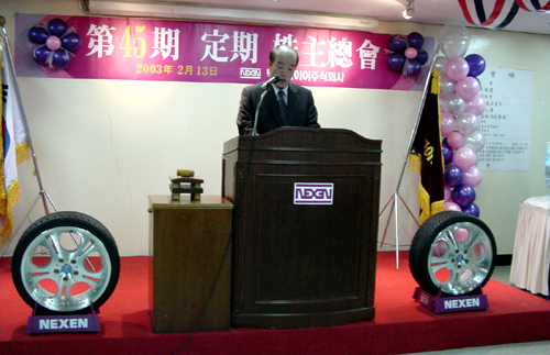 넥센타이어 주총장의 모습은 잔칫집 그대로였다. 먼데서 오는 손님을 맞는다는 생각 때문인지 아니면 4년째 가장 먼저 주총을 한다는 자부심 때문인지 어느 주총장보다도 정성스레 준비한 손길이 느껴졌다. 넥센타이어의 상징인 Roadman을 형상화한 얼음조각, 원탁테이블에 놓여진 다과와 음료수에도 그랬지만 가장 눈길이 간 것은 역시 한복을 곱게 차려 입고 주주들을 맞는 넥센타이어 여직원들이었다.