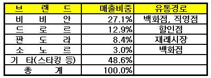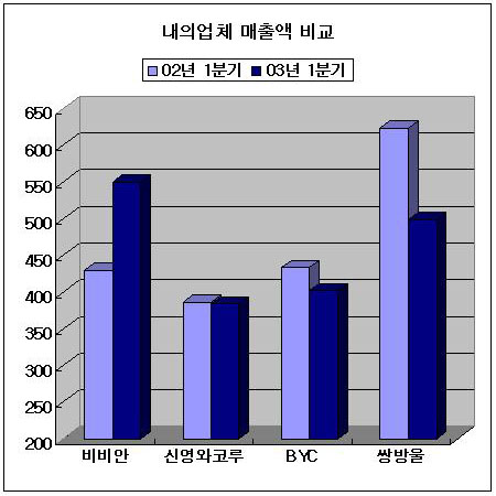 최근 1분기 실적은 이런 경향이 더욱 심화되고 있다. 비비안은 이 기간 동안 전년 동기보다 28% 성장한 550억원의 매출을 달성하면서 작년 4분기에 이어 2분기 연속 부동의 1등이던 쌍방울을 제쳤다. 이에 비해 쌍방울은 전년동기대비 20% 감소한 499억원을, BYC는 7%가 줄어든 384억원의 매출액을 기록했다. 신영와코루는 지난해와 거의 비슷한 384억원의 매출을 냈다.