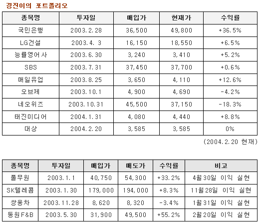 스노우보드 삼매경에서 깨어 주식 시세를 봤는데 너무 깜짝 놀랐답니다. 작년 5월에 산 동원F&B가 무려 5만원에 육박하는 것 아니겠어요. 수익률이 55%가 났는데 풀무원으로 세운 최고 수익률을 갱신해버렸답니다. 그 이유를 물어봤더니 요즘 광우병과 조류독감으로 사람들이 고기를 안 먹어서 참치 소비를 늘인 덕에 동원F&B가 올랐다고 하더라구요.