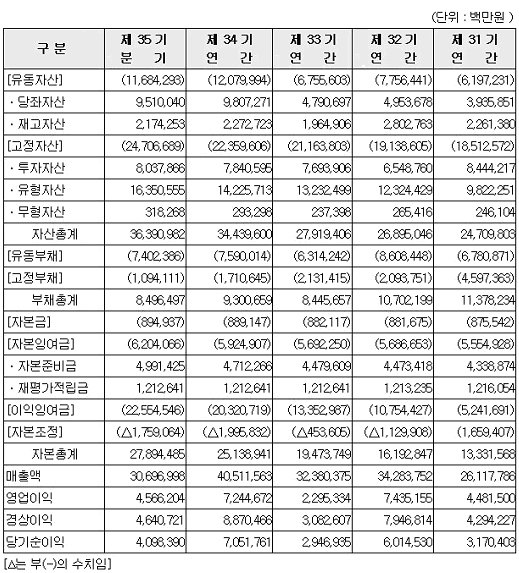Ⅲ. 재무에 관한 사항 에서 1. 요약재무정보 를 살펴보자. 처음 대차대조표와 손익계산서를 보는 사람은 ‘4. 재무제표’에 나와있는 복잡한 서식을 보는 것보다 ‘1. 요약재무정보’에 나와 있는 간략 자료를 보는 것이 편하다.