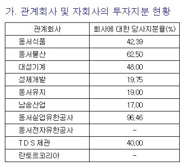 일례로 아래는 동서식품의 모회사로 유명한 동서의 분기보고서에 나와 있는 관계회사의 지분현황이다.