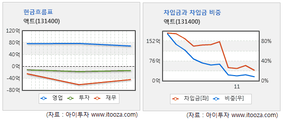 현금활동흐름도 우량하다. 영업활동현금흐름은 꾸준히 (+)를 기록하고 있으며, 재무와 투자활동현금흐름은 (-)를 보이고 있다. 이는 제품을 판매해 꾸준히 현금을 벌어들이고 있으며, 차입금 상환 및 투자활동에 자금을 사용하고 있다는 뜻이다. 실제로 액트의 차입금과, 자산에서 차입금이 차지하는 비중도 지속적으로 줄어들고 있다. (그림2 참고)