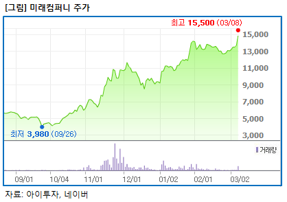 [아이투자 이래학] 최근 미래컴퍼니 주가가 강세를 보이고 있어 관심을 끈다. 지난 8일엔 52주 신고가를 경신하기도 했다. 6개월 전 새 주가가 4배 가까이 올랐다. 투자자들의 뜨거운 구애를 받고 있는 미래컴퍼니15,220원, ▲980원, 6.88%의 매력은 무엇일까.