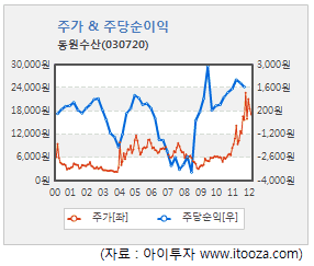 | 동원수산 | 17,600원 | ▲1,350원 (8.3%) | 862 | 55 | 46 | 12.9 | 1.32 | 13.5% |