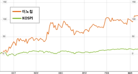 휴대폰용 전자파 보호 칩 제조회사 모다이노칩1,651원, ▼-9원, -0.54%의 주가가 상승하고 있다. 이노칩은 작년 9월 주가 5000원대부터 상승을 시작해 현재 1만2000원대까지 140% 상승했다. 이노칩의 최근 6개월간 수익률은 시장수익률을 크게 상회했다. 이노칩의 주가 상승은 계속될 수 있을까.[표1] 최근 6개월간 이노칩-코스피 지수 수익률 비교 차트