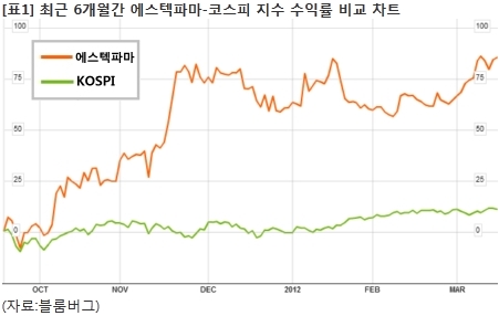 원료의약품 제조기업 에스텍파마의 주가가 다시 상승하고 있다. 에스텍파마의 주가는 작년 10월 4900원대에서 거래돼다 12월에 1만300원까지 급등했다. 에스텍파마는 현재 9400원대에 거래돼 52주 최저가 3600원 대비 162% 상승한 가격이다. 에스텍파마의 최근 6개월간 수익률은 시장수익률을 50% 이상 상회했다. 에스텍파마의 주가상승은 계속될 수 있을까.