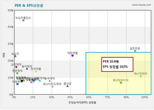 에스텍파마는 차트의 오른쪽 하단인 4사분면에 위치해 있다. 이 영역은 상대적으로 PER은 낮고 EPS 성장률이 높은 기업이 해당한다. 이러한 기업은 투자매력도가 높다고 판단한다. 에스텍파마의 현재 PER은 10.8배, 3년간 연평균 EPS 성장률은 102%다.