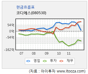 코디에스의 현금흐름표를 보면 투자를 확대하고 있음을 알 수 있다. 지난 2010년부터 영업과 재무활동현금흐름은 (+), 투자활동현금흐름은 (-)를 기록하고 있다. 일반적으로 성장기 기업에서 나타는 유형으로, 영업활동을 통해 벌어들인 돈에 차입금을 보태 투자를 확대하고 있다는 뜻이다.