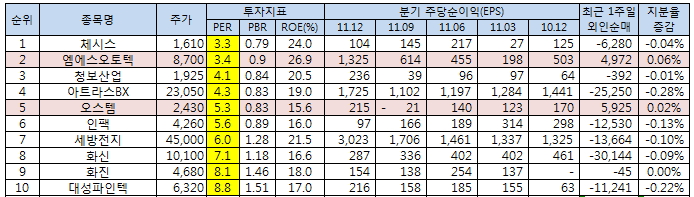 체시스1,040원, 0원, 0% 외에 엠에스오토텍2,080원, ▲55원, 2.72%, 청보산업, 아트라스BX, 오스템1,043원, ▲11원, 1.07%, 인팩6,060원, ▼-110원, -1.78%, 세방전지61,400원, ▲1,600원, 2.68%, 화신7,850원, ▲300원, 3.97%, 화진, 대성파인텍694원, ▲6원, 0.87% 이 10선에 포함됐다. 순이익은 IFRS 개별 기준이다.