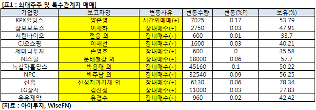 [아이투자 형재혁] 25일 증시 개장을 앞둔 가운데 아이투자가 전일 지분 공시를 집계한 결과, KPX홀딩스71,400원, ▲100원, 0.14%, 녹십자홀딩스15,870원, ▲490원, 3.19% 등의 최대주주·특수관계자가 지분을 추가로 매입한 것으로 나타났다. <아래표 참고>