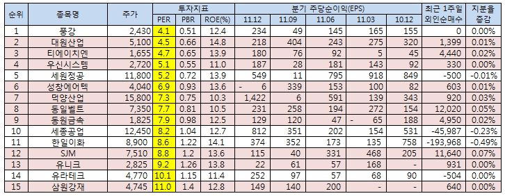 이 가운데 풍강2,640원, ▲30원, 1.15%은 PER이 4.1배로 자동차 업종 우량주 중에서 가장 낮았다. ROE는 12.4%, PBR은 0.51배다. 풍강2,640원, ▲30원, 1.15% 외에 대원산업13,680원, ▲40원, 0.29%, 티에이치엔6,150원, ▼-200원, -3.15%, 우신시스템6,050원, ▲50원, 0.83%, 세원정공12,000원, ▼-20원, -0.17%, 성창에어텍, 덕양산업, 동일벨트, 동원금속1,294원, ▲23원, 1.81%, 세종공업, 한일이화, SJM3,640원, ▲10원, 0.28%, 유니크4,475원, ▲70원, 1.59%, 유라테크7,540원, ▲60원, 0.8%, 삼원강재2,415원, 0원, 0%가 15선에 포함됐다. 순이익은 K-IFRS 개별기준이다.