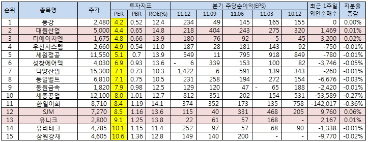 이 가운데 풍강2,640원, ▲30원, 1.15%은 PER이 4.2배로 자동차 업종 우량주 중에서 가장 낮았다. ROE는 12.4%, PBR은 0.52배다. 풍강2,640원, ▲30원, 1.15% 외에 대원산업13,620원, ▼-20원, -0.15%, 티에이치엔6,100원, ▼-250원, -3.94%, 우신시스템6,030원, ▲30원, 0.5%, 세원정공12,000원, ▼-20원, -0.17%, 성창에어텍, 덕양산업, 동일벨트, 동원금속1,293원, ▲22원, 1.73%, 세종공업, 한일이화, SJM3,650원, ▲20원, 0.55%, 유니크4,475원, ▲70원, 1.59%, 유라테크7,540원, ▲60원, 0.8%, 삼원강재2,405원, ▼-10원, -0.41%가 15선에 포함됐다. 순이익은 K-IFRS 개별기준이다.