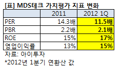| MDS테크 | 14,150원 | ▲400원 (2.9%) | 611 | 80 | 88 | 11.5 | 2.09 | 15.5% |