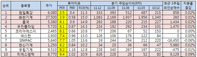 원일특강7,670원, ▲80원, 1.05% 외에 화천기계4,595원, ▲60원, 1.32%, 흥국5,090원, ▲30원, 0.59%, 우진플라임1,933원, ▼-14원, -0.72%, 코리아에스이, 넥스턴앤롤코리아2,260원, ▲75원, 3.43%, SIMPAC4,860원, ▲75원, 1.57%, 한신기계3,060원, ▲105원, 3.55%, 우림기계, 티에스엠텍이 10선에 포함됐다. 순이익은 K-IFRS 개별 기준을 적용했다.