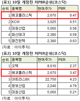 에코플라스틱은 아이투자에서 매일 서비스하는 저PER, 저PBR 주식 코너의 단골 손님이다. 에코플라스틱은 코스닥 상장 자동차 부품 기업 저PBR 부문 1위, 저PER 부문 2위에 위치한 기업이다. 일반적으로 PBR과 PER이 낮으면 저평가된 기업으로 판단한다.