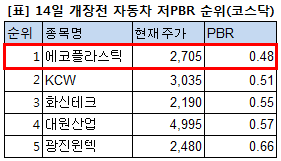 에코플라스틱은 아이투자에서 매일 제공하는 저PER, 저PBR 주식 코너의 단골 손님이다. 에코플라스틱은 코스닥 상장 자동차 부품 기업 저PBR 부문 1위 기업이다. 일반적으로 PBR이 낮으면 저평가된 기업으로 판단한다.