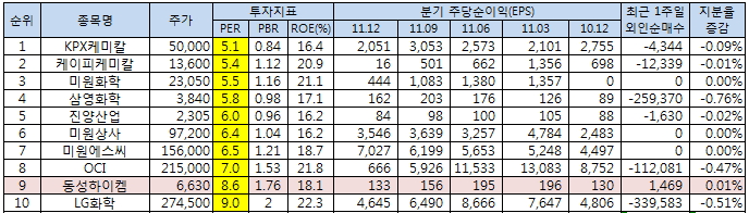 KPX케미칼52,200원, ▼-700원, -1.32%외 케이피케미칼, 미원화학87,100원, 0원, 0%, 삼영화학, 진양산업6,860원, ▲120원, 1.78%, 미원상사145,200원, ▲400원, 0.28%, 미원에스씨137,200원, ▲2,900원, 2.16%, OCI58,500원, ▲1,200원, 2.09%, 동성하이켐, LG화학396,500원, ▲33,500원, 9.23%이 10선에 포함됐다. 순이익은 IFRS 개별기준이다. LG화학이 신규로 편입되며 이엔에프테크놀로지가 제외됐다. LG화학은 전일 1.2% 하락하며 PBR이 2배가 돼 기준을 충족했다.