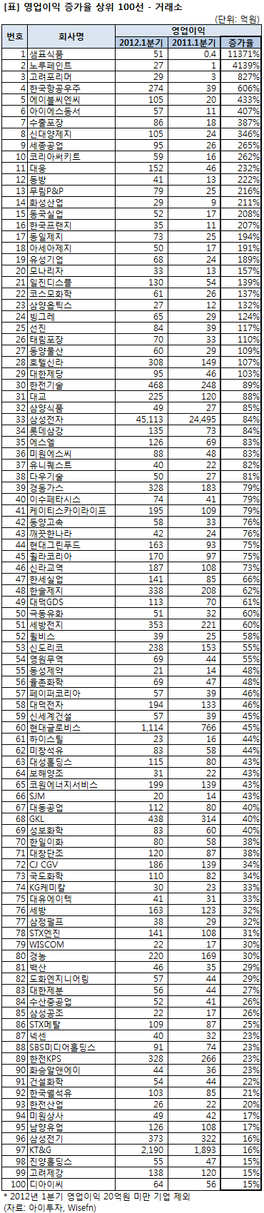 [아이투자 정연빈] 거래소 기업 중 전년 동기 대비 1분기 영업이익 증가율이 높은 상위 100개 기업을 아이투자가 16일 정리했다. 이에 따르면 샘표식품29,350원, ▲600원, 2.09%이 11371%로 가장 높았다. 이 밖에 노루페인트8,090원, ▼-10원, -0.12%, 고려포리머, 한국항공우주110,200원, ▲1,600원, 1.47%, 에이블씨엔씨9,340원, ▲50원, 0.54% 순으로 영업이익 증가율이 높았다. 1분기 영업이익이 20억원 미만인 기업은 제외했다.