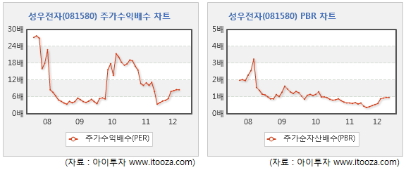 현재 성우전자의 주가수익배수(PER)는 6.4배로 5년 평균치 10.5배 대비 낮다. 주가순자산배수(PBR)는 0.79배로 평균 1.16배 대비 낮다.
