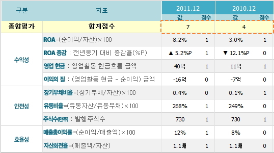 * 매출액, 영업이익, 순이익은 2011년 1월~12월 누적, 단위는 억원, K-IFRS 개별 재무제표 기준.