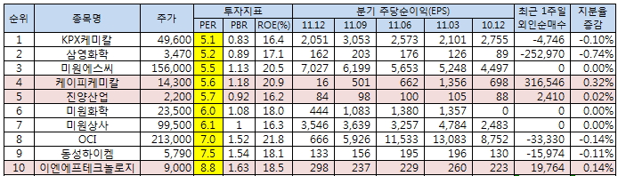 KPX케미칼52,400원, ▼-500원, -0.95%외 삼영화학, 미원에스씨138,800원, ▲4,500원, 3.35%, 케이피케미칼, 진양산업6,860원, ▲120원, 1.78%, 미원화학87,100원, 0원, 0%, 미원상사145,700원, ▲900원, 0.62%, OCI58,600원, ▲1,300원, 2.27%, 동성하이켐, 이엔에프테크놀로지43,250원, ▲150원, 0.35%가 10선에 포함됐다. 순이익은 IFRS 개별기준이다.