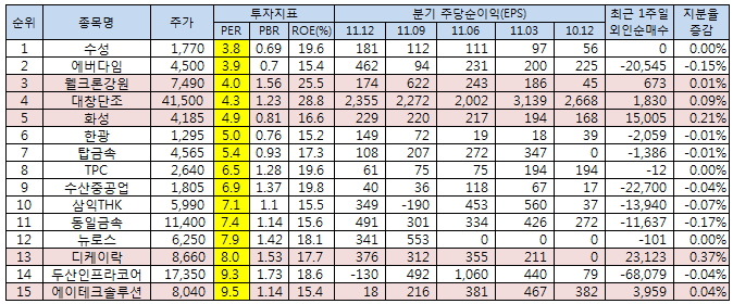 수성웹툰3,235원, ▲25원, 0.78% 외에 현대에버다임8,390원, ▲180원, 2.19%, 웰크론강원, 대창단조6,440원, ▲30원, 0.47%, 화성밸브7,780원, ▲210원, 2.77%, 대한광통신1,882원, ▼-14원, -0.74%, 탑금속, TPC2,020원, 0원, 0%, 수산중공업, 삼익THK9,960원, 0원, 0%, 동일금속7,840원, ▲80원, 1.03%, 디케이락9,700원, ▲120원, 1.25%, 뉴로스, 두산인프라코어, 에이테크솔루션5,420원, ▲40원, 0.74%이 15선에 포함됐다. 순이익은 IFRS 개별기준이다. 뉴로스는 올 해 2월 신규상장된 종목으로 지난해 2분기 이전 주당순이익 자료가 없다. 15선 중에서 삼익THK는 올해 1분기 실적이 반영됐다.