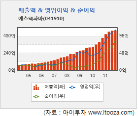지난해까지 에스텍파마는 매해 실적을 꾸준히 늘려왔다. 2006년 132억원이던 매출액은 연평균 34% 늘어 지난해 560억원을 기록했다. 14억이던 영업이익은 52%씩 늘어 112억원, 11억원이던 순이익은 51%씩 늘어 85억원을 기록했다.