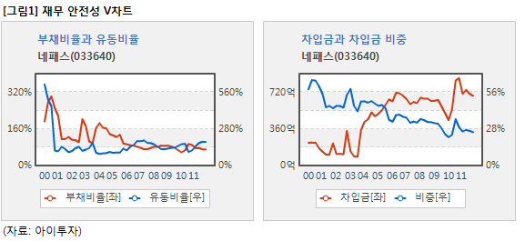 네패스의 재무상태는 안전한 편에 속한다. 단기 지급능력 지표인 유동비율은 180%, 타인자본 의존도 지표인 부채비율은 70%다. 이자 지급이 필요한 부채 규모를 나타내는 차입금 비중은 26%로 위험 수준인 40%의 절반보다 조금 높은 수준이다. 유동비율은 높을수록, 부채비율과 차입금 비중은 낮을수록 재무구조가 우량한다고 판단한다.