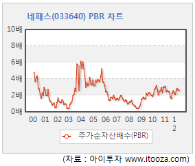 네패스의 주가순자산배수(PBR)는 2.5배로 5년 평균치인 1.9배보다 30% 높은 수준이다. 10년간 최대치는 6.1배, 최저치는 0.4배다. PBR은 시가총액을 자본총계로 나눈 값으로 낮을수록 그 주식은 저평가 된 것으로 판단한다.