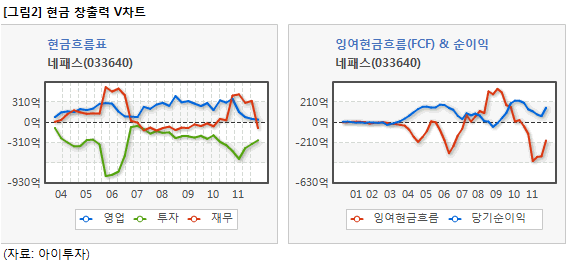 현금흐름은 보통수준에 속한다. 영업활동으로 인한 현금흐름은 43억원으로 플러스(+)를 나타내고 있으며, 투자활동으로 인한 현금흐름과 재무활동으로 인한 현금흐름은 각각 -276억원, -88억원을 기록하고 있다. 현금흐름이 영업활동 (+), 투자활동 (-), 재무활동 (-)로 나타낼 때 성숙기에 속한 우량기업으로 판단한다. 네패스의 경우 (+)(-)(-) 구조를 지니지만, 영업으로 벌어들인 현금에 비해 투자로 소모되는 현금이 커 매우 원활한 수준으로 보기엔 무리가 있다.