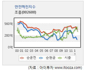 조흥은 시가총액이 순운전자본 밑에서 거래되는 종목이다. 현재 시가총액은 413억원, 올해 3월 말 순운전자본은 430억원이다. 순운전자본은 유동자산에서 유동부채를 뺀 금액이다.