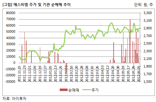 에스비엠에 기관의 순매수 물량이 집중된 것은 지난해 11월부터 올해 1월까지다. 한 동안 잠잠했던 기관은 지난 4월부터 에스비엠 주식을 다시 담기 시작했다. 기관의 순매수세는 6월 초까지 이어졌다. 1차 매수세가 집중됐던 작년 11월~올해 1월 에스비엠의 주가는 2000원에서 2300원을 오갔다. 또 한 번 기관의 매수세가 유입되던 4월부터 6월까지 주가는 2600원에서 3000원을 오르내렸다. 최근 7개월 동안 기관의 순매수량은 75만8260주로 KB자산이 공시한 보유 물량 74만5260주와 유사하다.