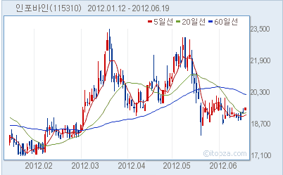 19일 오전 10시 30분 인포바인76,200원, ▲3,900원, 5.39%은 전일대비 2.6% 상승한 1만9700원에 거래되고 있다. 이틀 연속 상승세다. 인포바인은 지난 5월 초 2만3000원을 기록하고 열흘간 조정을 받은 뒤 1만8000원에서 2만원 대의 박스권에 갇혀 있는 모습이다.