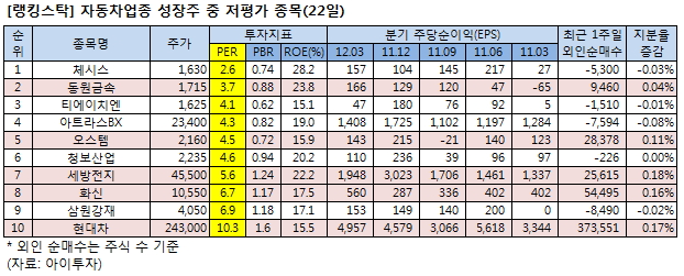 [랭킹스탁] 미인주(고성장 저평가) 10선-자동차업종