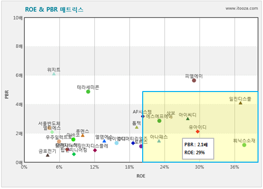아이투자에서 개발한 ROE & PBR 매트릭스 차트에 따르면 유아이디는 상장된 디스플레이 업종 중에서 수익성이 높고 저평가돼 있는 종목으로 분류됐다. 유아이디는 차트의 4사분면인 오른쪽 하단에 위치해 있다. 이 영역은 상장된 디스플레이 업종 중에서 자기자본비율(ROE)이 높고 주가순자산배수(PBR)가 낮은 기업이 포함된다. 이러한 기업은 수익성이 좋고 저평가됐다고 판단한다. 유아이디의 ROE는 29%, 현재 PBR은 2.1배다.