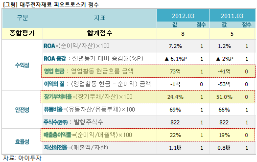 실적개선으로 기업의 체질도 바뀌고 있다. 아이투자에서 제공하는 피오트로스키 점수를 활용하면 기업의 체질개선 여부를 파악할 수 있다. 대주전자재료의 올해 1분기 피오트로스키 점수는 8점으로 전년 동기보다 3점 올랐다. 항목별로는 수익성, 안전성, 효율성 부문에서 각각 1점씩 취득했다.