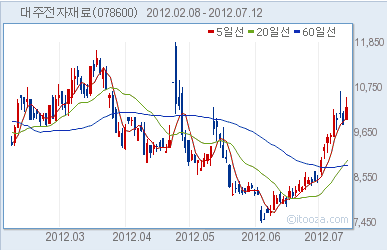 12일 오후 12시 57분 대주전자재료는 전일보다 4.6% 상승한 1만300원을 기록하며 다시 상승세에 들어섰다. 이 회사의 주가는 지난달 4일 7450원을 기록하며 연중 최저가를 기록한 후 한달 남짓한 기간동안 37% 상승했다. 같은 기간 코스피지수 상승률이 2%였던 점과 대조된다.