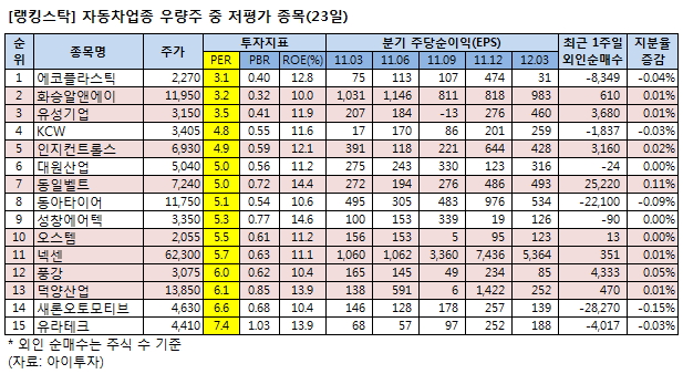 에코플라스틱3,060원, ▲100원, 3.38% 외 화승알앤에이3,165원, ▲50원, 1.61%, 유성기업2,020원, ▲36원, 1.81%, KCW, 인지컨트롤스5,990원, ▲130원, 2.22%, 대원산업13,650원, ▲10원, 0.07%, 동일벨트, 동아타이어, 성창에어텍, 오스템1,029원, ▼-3원, -0.29%, 넥센5,670원, ▲70원, 1.25%, 풍강2,640원, ▲30원, 1.15%, 덕양산업, 새론오토모티브3,120원, ▲20원, 0.65%, 유라테크7,530원, ▲50원, 0.67%가 15선에 포함됐다. 연결 지배지분 또는 지분법이 적용된 순이익과 자본을 적용해 투자지표를 산출했다.