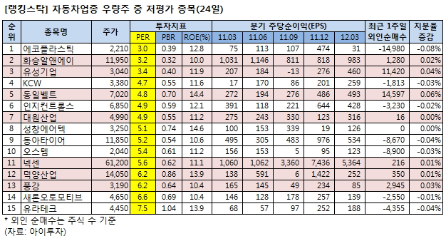 이 가운데 에코플라스틱3,065원, ▲105원, 3.55%은 PER이 3배로 자동차 업종 우량주 중에서 가장 낮았다. ROE는 12.8%, PBR은 0.39배다.